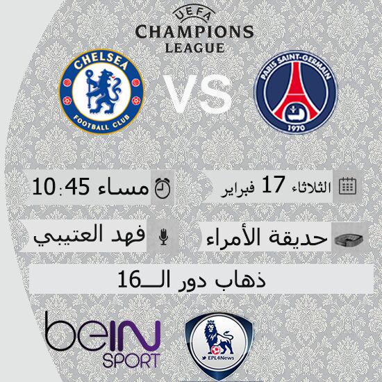 : باريس x تشيلسي , الساعة الـ10:45 مساءً , القناة : beIN Sports HD1 , تعليق : فهد العتيبي